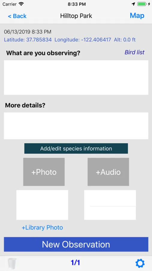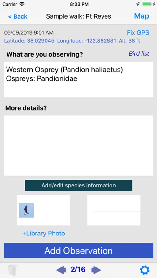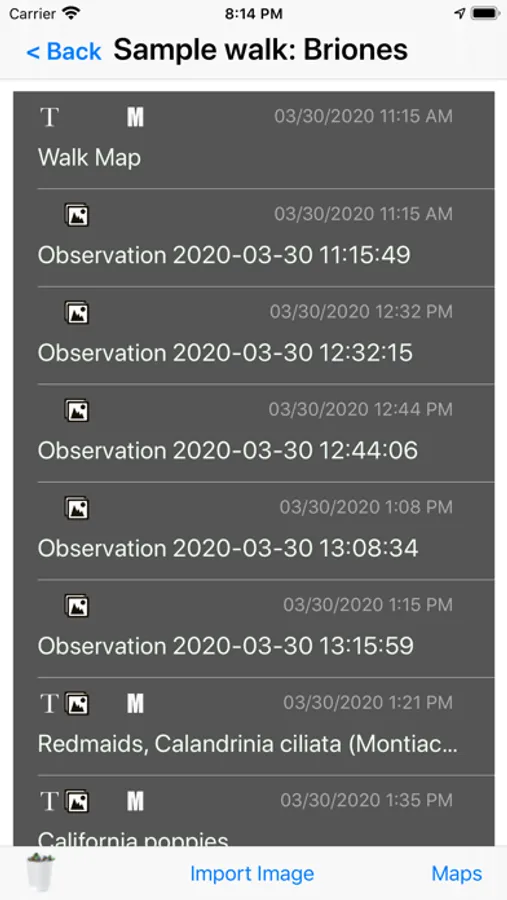 Even without a recorded hike, create a new record from a set of location-encoded photographs, and see exactly where you took the photos, using the embedded Apple Maps features. If the photos contain captions from another photo-editing program, the captions will be copied into NatureNotes titles for immediate labelling within NatureNotes. All slideshow features and email or Web sharing features can then be used with the new records.