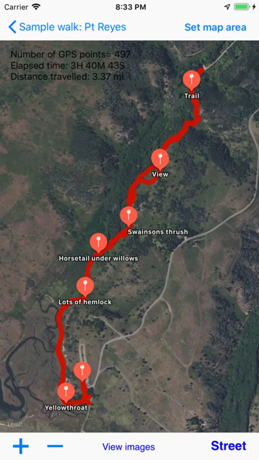 Apple maps embedded in NatureNotes shows where you are at all times, as well as where you've been on your hike. Satellite view can show you the terrain with a data connection. If you repeat a hike you've taken before, you can use the interactive map to see where you are relative to your last hike.