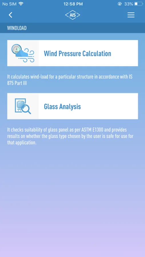 The facade of every building is subjected to some kind of pressure from the environment, AIS Wind load calculations are designed for wind-loads for various Indian cities specified in IS 875 and further it uses the calculations specified by ASTM E1300.
