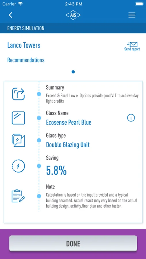 The energy simulator takes into account factors like building type, orientation, type of glaze,