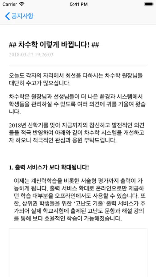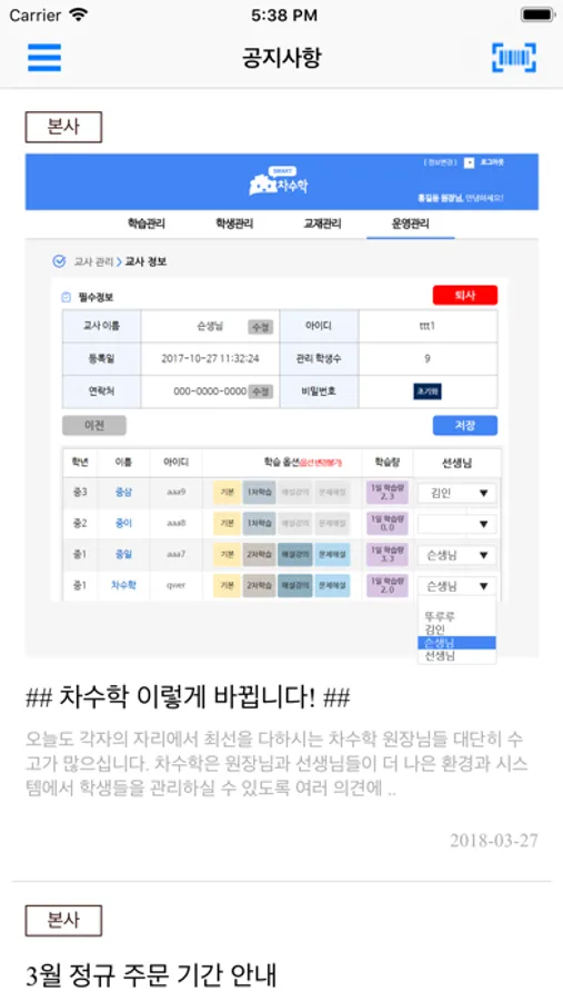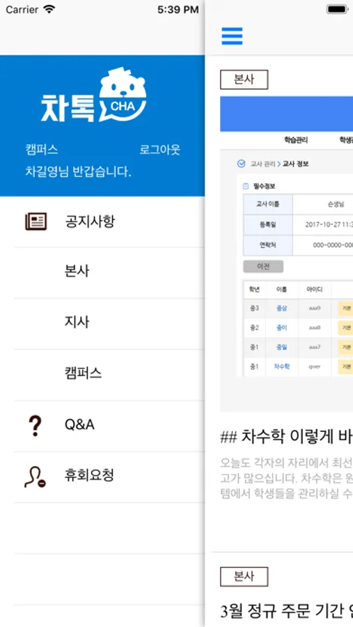 원장님께서 학원에 공지를 알리거나 차수학에서 알리는 공지 및 새로운 소식이 오면 차톡(CHA Talk)를 통해 바로바로 확인할 수 있습니다.