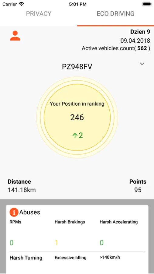 - The Eco Driving (Driver Scoring) allows user to see their driving score based on abuses and distance driven and their rank position in the company.