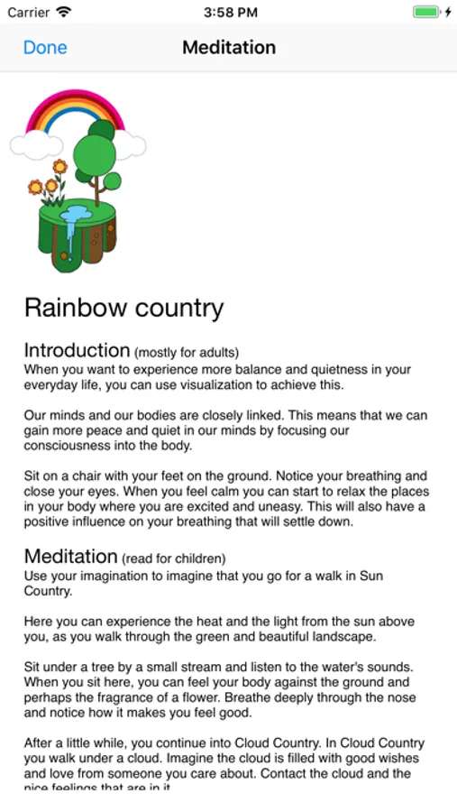 Meditation gives focus and new energy. Rainbow Country introduces consciousness and bodyawareness. Meditation is for everyone and with this app you can get a simple and fun introduction to an exciting world of meditation and mindfulness.