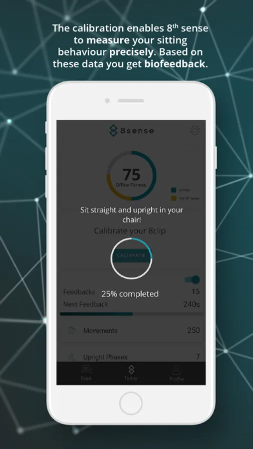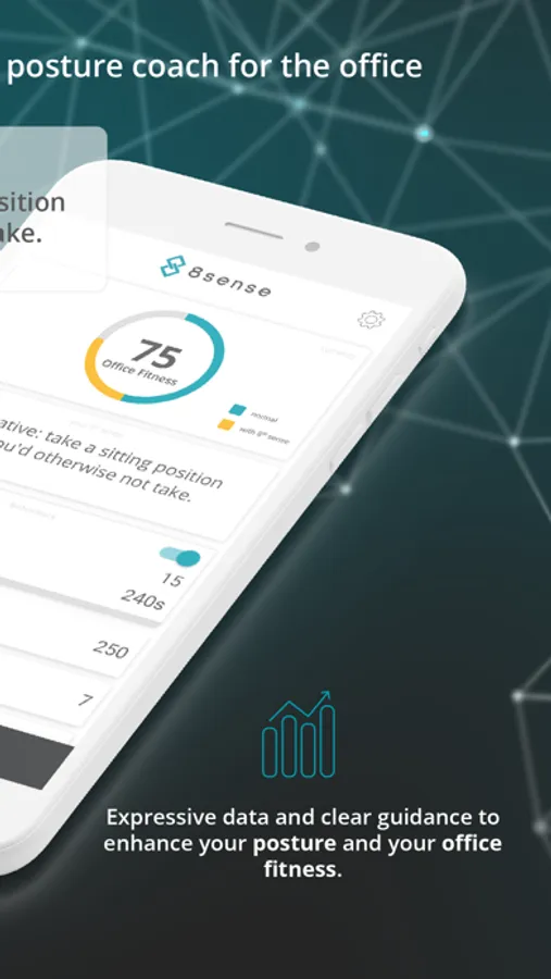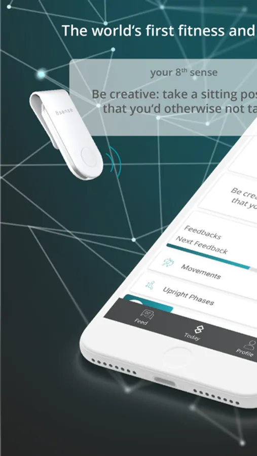 An attachable coach for your clothes. Helps you to sit more active. With posture training. Informs you about your current fitness level in the office. 8sense is designed to increase your health and productivity. And to protect.