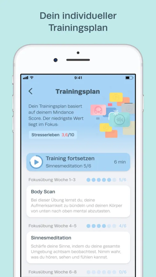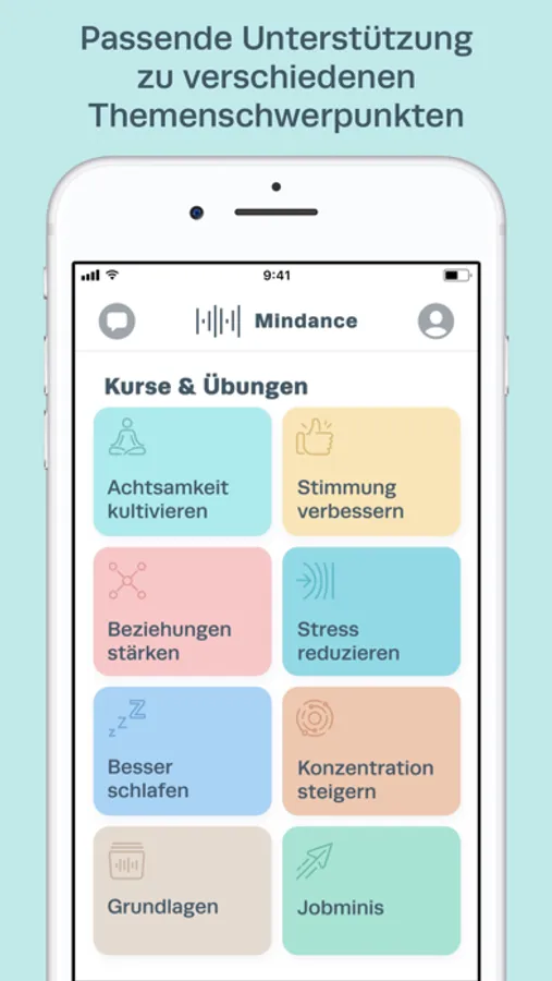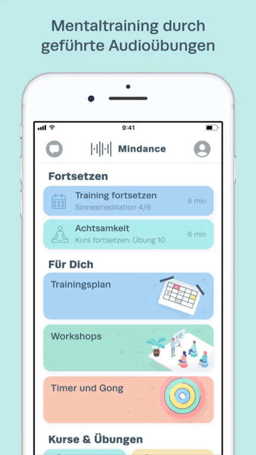 Mindance is your personal assistant for more well-being. Whether you feel stressed and want to relax, you just want to concentrate better, or you want to improve your relationship with yourself and others, your personal training plan addresses your individual needs. For this purpose, a variety of different guided meditations, relaxation exercises and psychological techniques are available to you. Whether you are a beginner or advanced, our speaker will guide you through the exercises and explain everything step by step.
