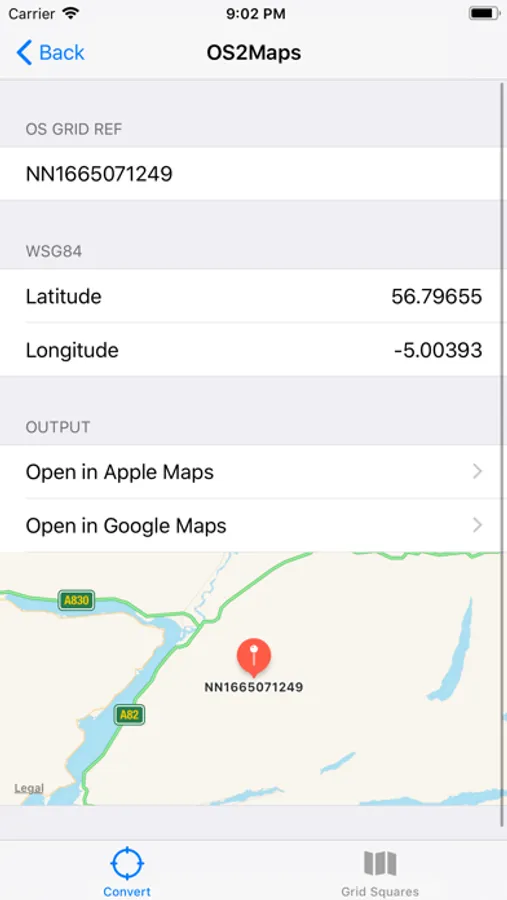 Following conversion the app enables the location to be opened easily in Apple or Google Maps.