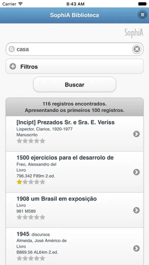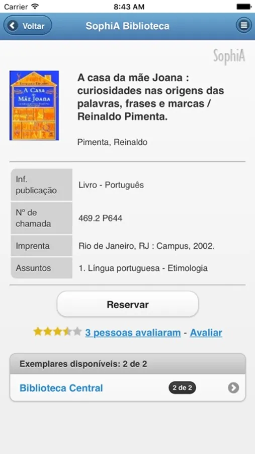 O App SophiA Biblioteca é o seu canal direto para fazer pesquisas, realizar ou cancelar reservas, renovar empréstimos, visualizar as últimas aquisições, consultar dados da biblioteca ou ainda acessar publicações digitais. Conecte seu smartphone ou tablet à biblioteca da sua instituição e tenha acesso a diversos serviços.