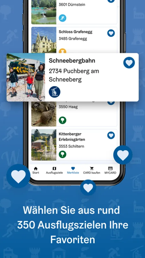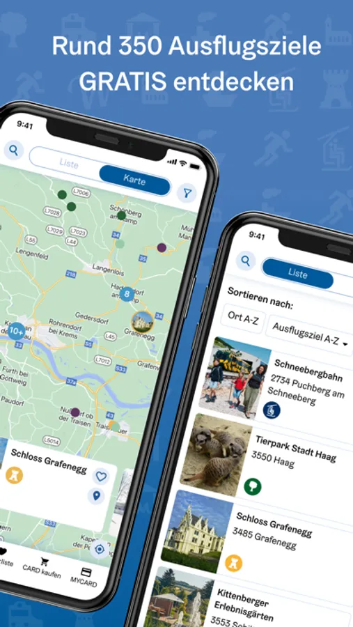 Erfrischend vielseitig – das ist die Niederösterreich-CARD, die Ihnen die Türen bei rund 350 Ausflugszielen in Niederösterreich, Wien und umliegenden Bundesländern GRATIS öffnet. Mit der gelben Ausflugskarte können Sie ein Jahr lang aus kostenlosen Erlebnissen auswählen: Von Burgen & Schlössern, über Bergbahnen, Schifffahrten, Freibädern, Naturparks, Gärten & Erlebniswelten, bis hin zu Museen & Ausstellungen. Da ist für alle etwas Spannendes dabei! Mit der NÖ-CARD App haben Sie immer und überall alle Vorteile der Niederösterreich-CARD mit dabei!