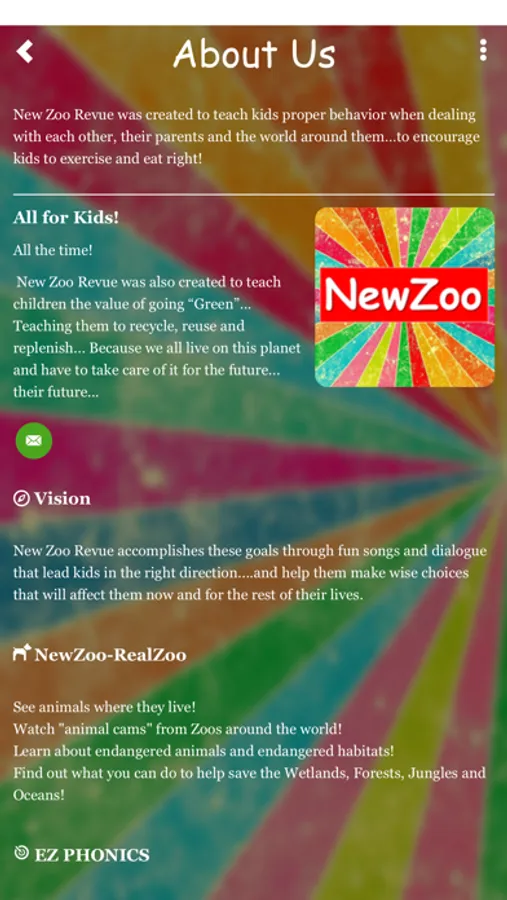 This is an app for kids about to learn about the New Zoo Revue television program and to learn about endangered animals and habitats, plus a phonic system to teach children how to read.