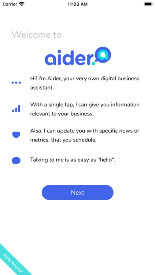 Aider is a digital assistant for your business. Aider uses the latest AI technology to provide business owners with key information and insights, either from data they generate or data available to them elsewhere. Through answers to questions and from scheduled notifications, Aider will deliver all the most up to date advice or analysis, prompt the user with actions that could improve their business and then facilitate that action being completed.