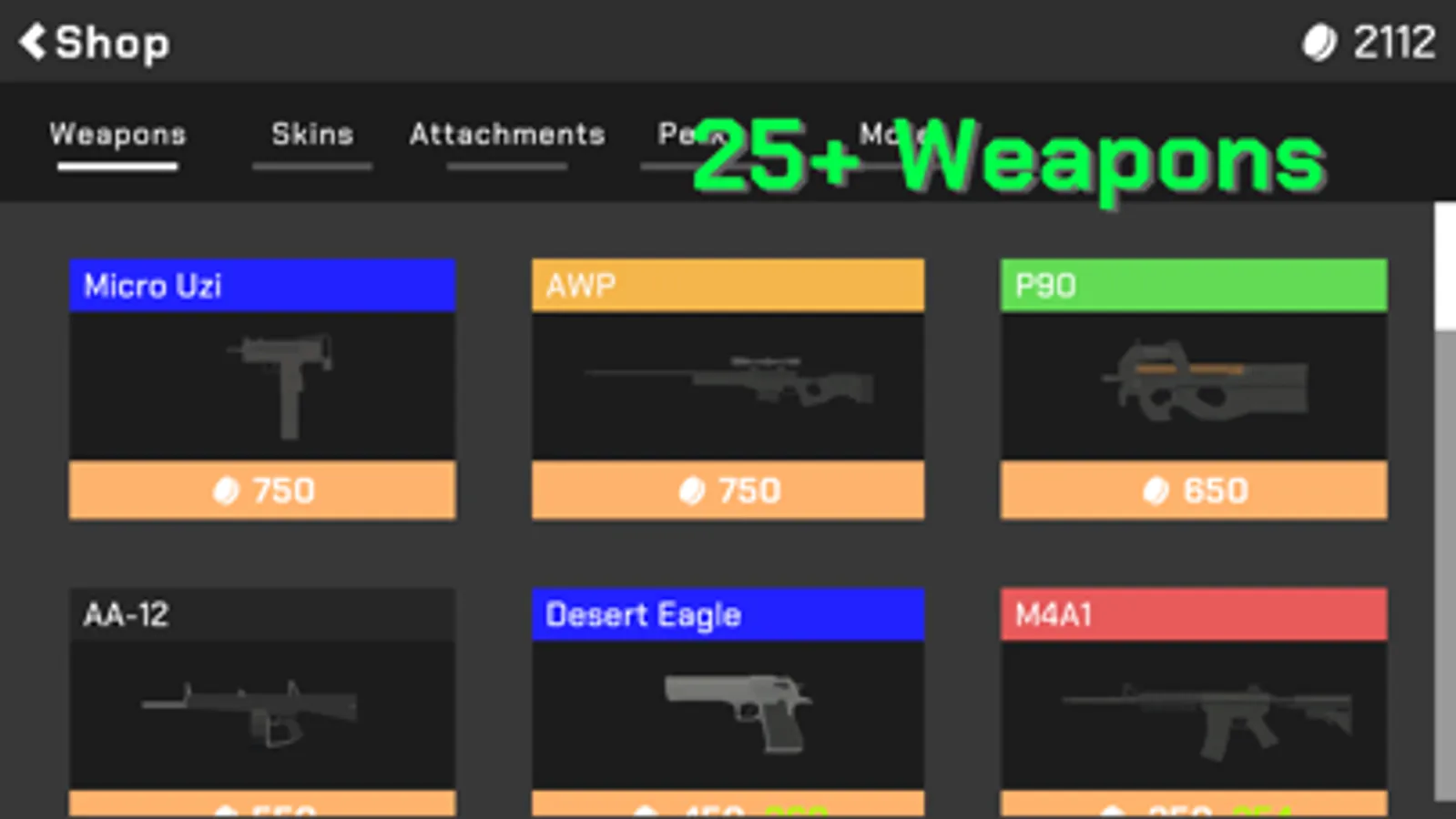 Weapons range from assault rifles, shotguns, snipers, submachine guns, and pistols that fall into three modes: full auto, semi auto, and three-round bursts. Weapons also can have attachments like a red dot sight, ACOG scope, or a suppressor. Skins like desert and snow camouflage are also available.