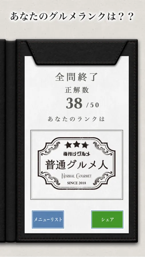 4)全50問回答後、一発で正解した数に応じてあなたのグルメ格付けが発表されます。