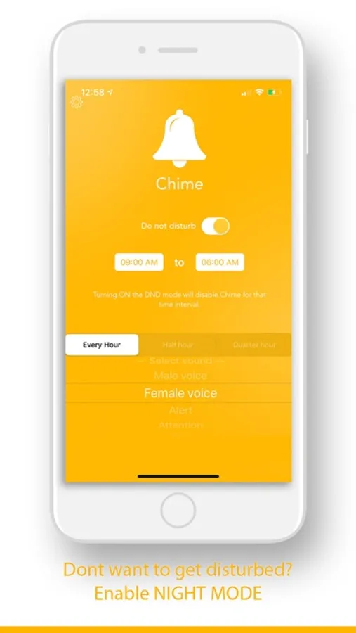 Personalized Alerts, Flexible Chime Intervals, Save Preferences, Night Mode, Time Range Customization, DND on weekends.