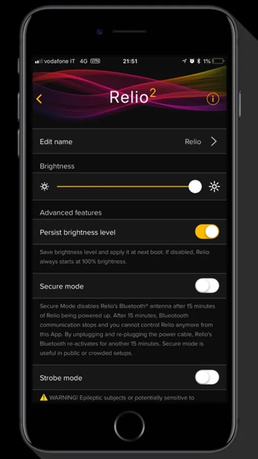 (*) Secure Mode disables Relio's Bluetooth® antenna after 15 minutes of Relio being powered up. After 15 minutes, Blueotooth communication stops and you cannot control Relio anymore from this App. By unplugging and re-plugging the power cable, Relio's Bluetooth re-activates for another 15 minutes. Secure mode is useful in public or crowded setups, where you want to prevent other poeple from controlling your lighting setup. Just power up and tune your lights 15 minutes before public opening, and you're set to go.