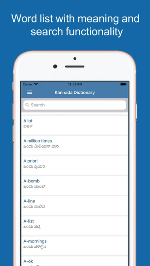 - We have a very Easy Interface to use, so everyone can use it simply without watching any tutorial. We worked hard to make everything easier to you. In the main screen, you will be able to see all words. There, you can type the english word that you are looking for and we will take care of finding the meanings of this word in Kannada language.