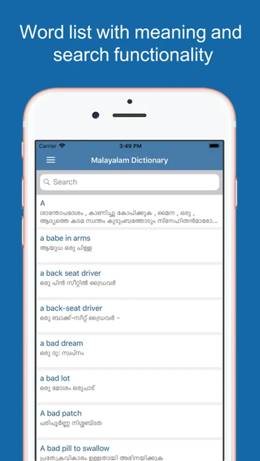 - We have a very Easy Interface to use, so everyone can use it simply without watching any tutorial. We worked hard to make everything easier to you. In the main screen, you will be able to see all words. There, you can type the english word that you are looking for and we will take care of finding the meanings of this word in Malayalam language.