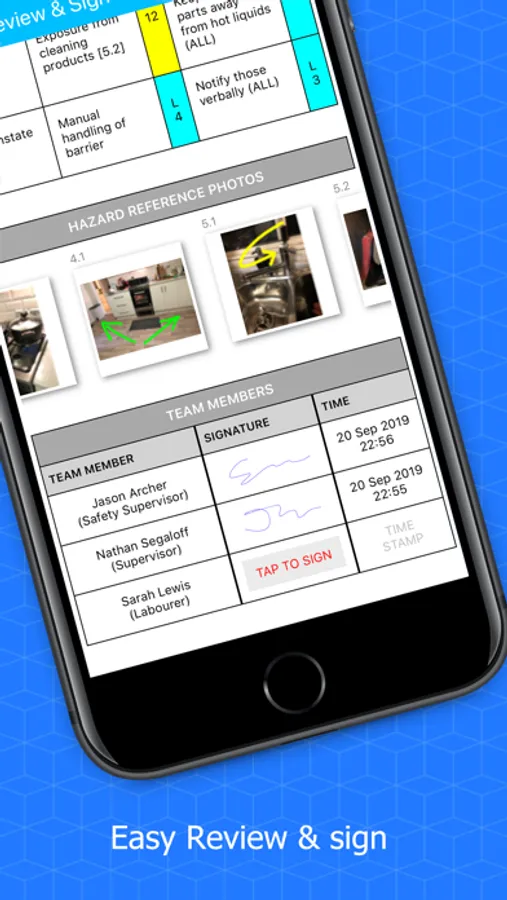 In very little time, you will be producing professional formatted and color-coded PDF files that have been digitally signed and timestamped. All team members can easily review the JSA/JHA, hazard reference photos and their assigned roles before signing (contact-free option available).