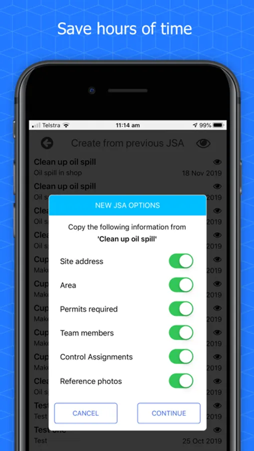 One of the huge time saving features is the ability to reuse most of a completed JSA/JHA when creating a new (similar one). Simply choose which parts you would like to include and 99% of the work is done for you!