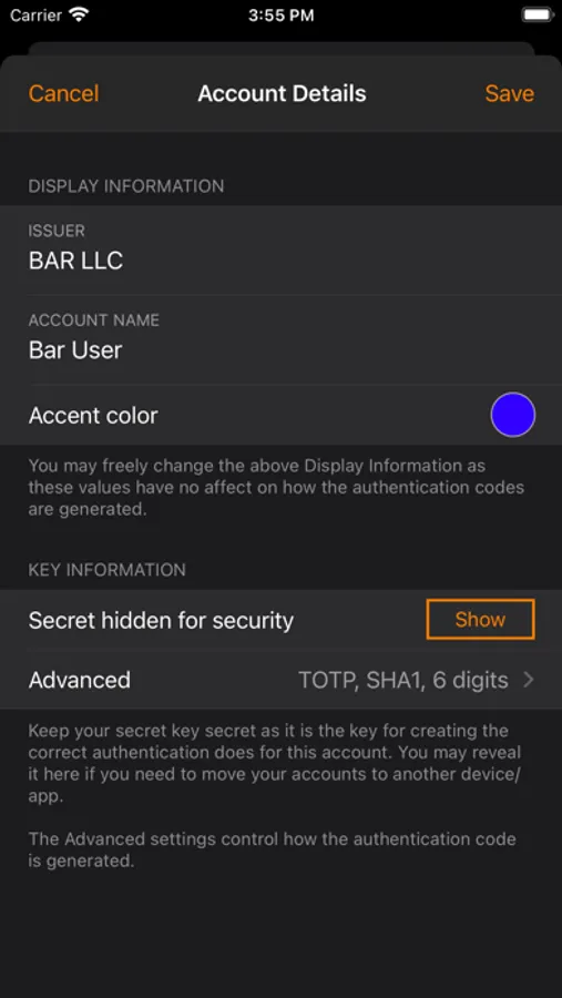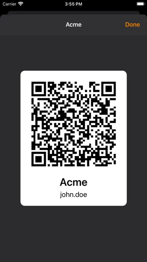 Swiping right on an account displays a QR Code button. This button will display the QR code for that account.