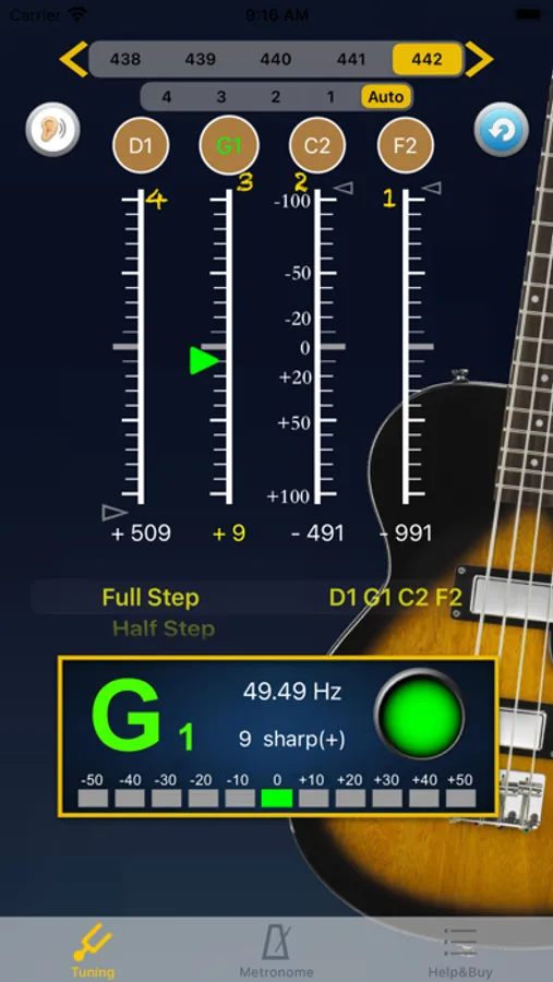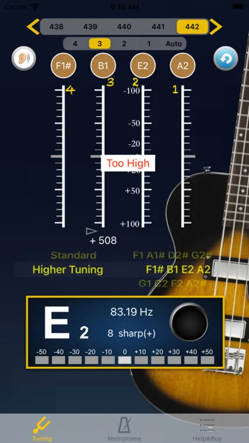 The simplest and most precise tuning APP with auto noise filtering. First step is choose the frequency at top of screen, then choose the tuning at the middle of the screen. When you play instrument, the pitch will be shown on the panel for the individual string by indicating signal high or low.