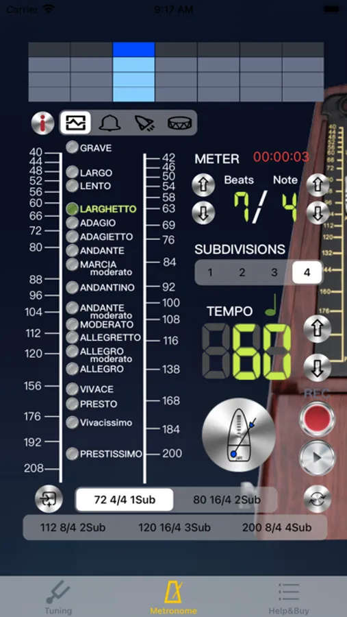 - Intuitive beat mode selection, 18 types, including: Grave 25-45 / Largo 40-60 / Lento 45-60 / Larghetto 60-66 / Adagio 66-76 / Adagietto 72-76 / Andante 76-108 / Andantino 80- 108 / Marcia moderato 83-85 /Andante moderato 92-112 / Moderato 108-120 / Allegretto 112-120 / 116-120/ Allegro 120-156 / Vivace 156-176 / Vivacissimo 172-176 / Presto 168-200 / Prestissimo 200 Bpm and over