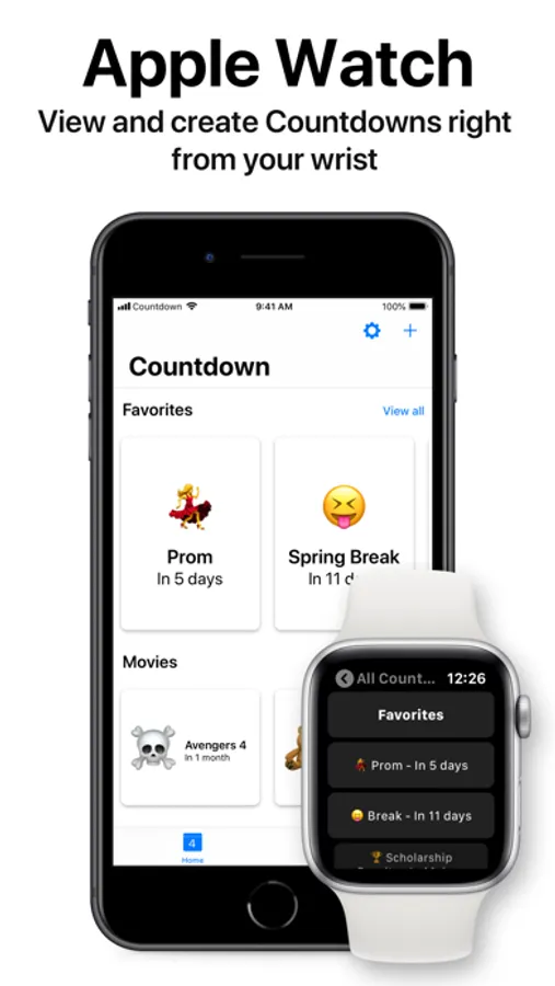 Use Apple Watch to track a specific countdown right from your watch face with the Countdown Complication, or view more info about a Countdown with the Watch app.