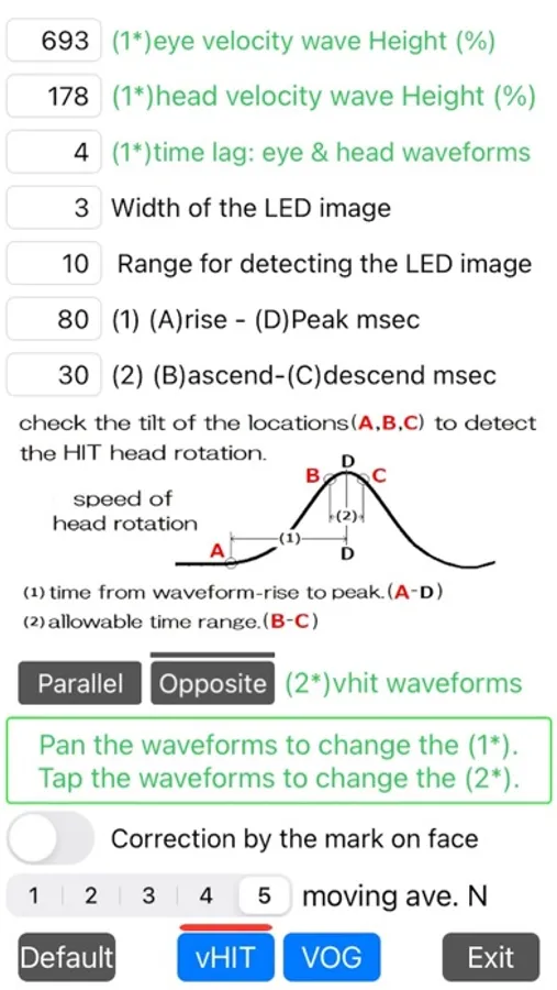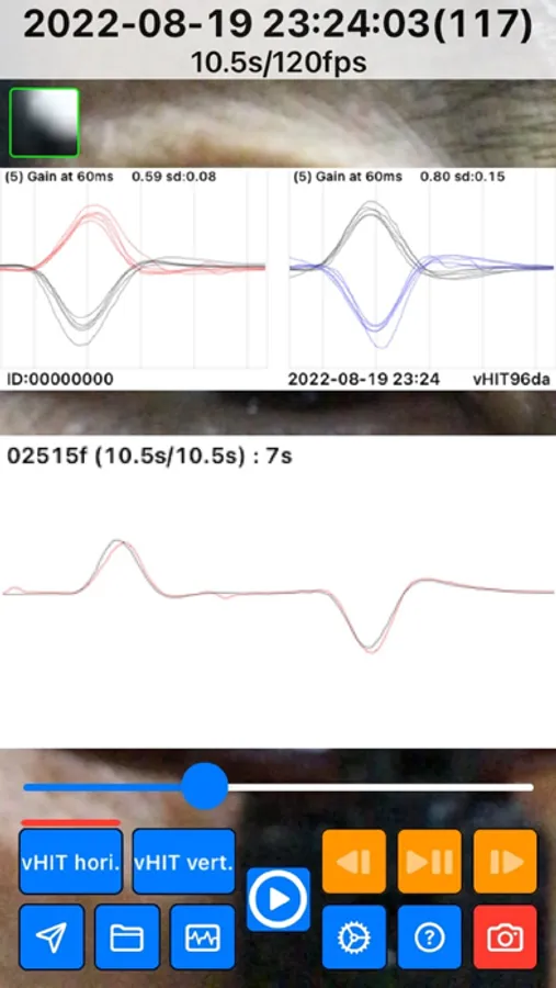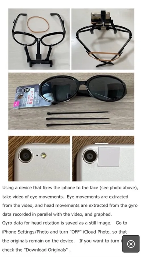 This is a vHIT application that can be done on the iPhone. This vHIT requires goggles to fix the iPhone to the face, but the materials and instructions for making the goggles are available at the author's URL. The application takes high-speed video of eye movements and analyzes the video to create a graph of eye movements. In parallel with the high-speed video recording, data from the iPhone's motion sensor is also acquired, and the head movement is graphed from that data. The results obtained from the analysis can be saved as an image. The saved image can be sent as an email attachment.