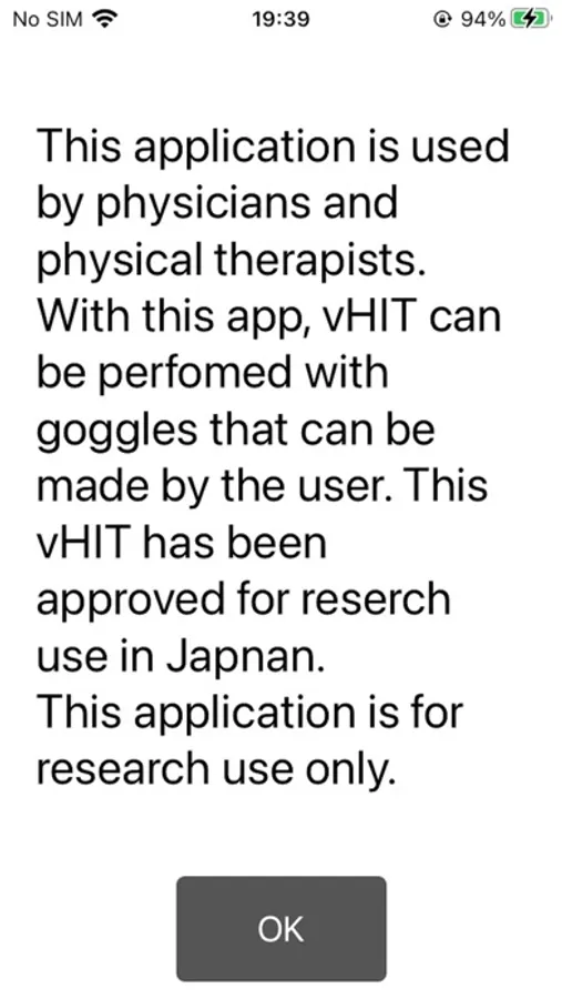 The vHIT test using this application and goggles has been approved for research use in Japan. This application can only be used for research purposes.