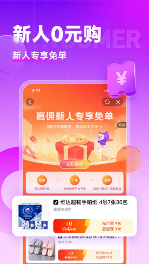 新人注册高佣联盟有惊喜,首次下单0元就能买购买,新人免单专区商品每日更新,0元也能领回家!!!