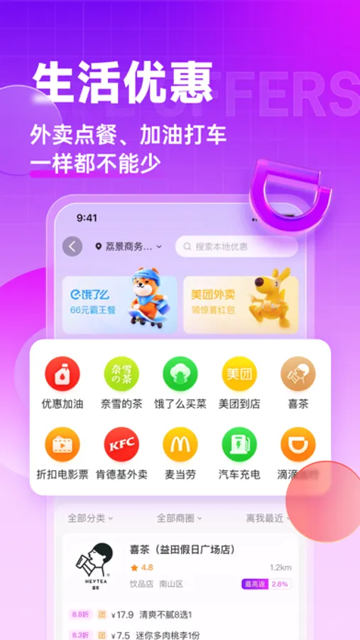 吃喝玩乐全覆盖。美食、外卖、出行打车、充电加油、酒店住宿,生活处处有优惠。