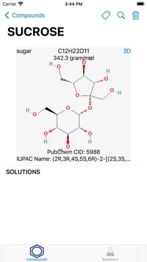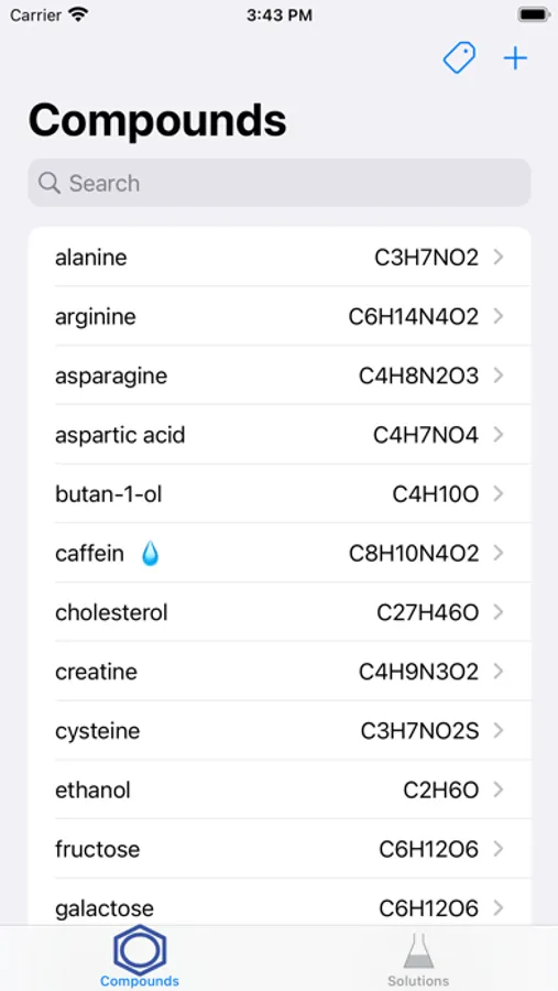 - If there are any solutions made of a compound, a 'droplet' will appear next to the compound's name.