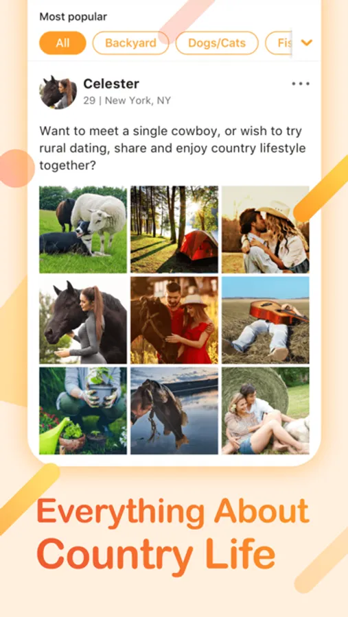 Meet and chat with real country /Rural folks! Date with single cowboys, cowgirls, farmers, ranchers, vegans, vegetarians, equestrians, pescatarians, and many others who love life in the great outdoors. Enjoy the country lifestyle on FARMLY farmers only dating app!