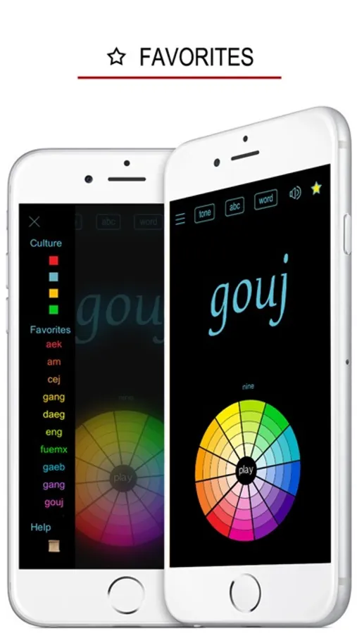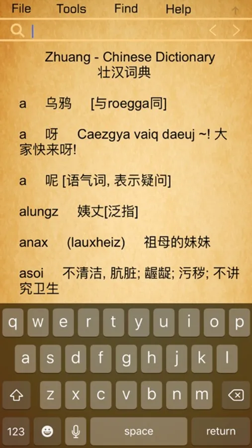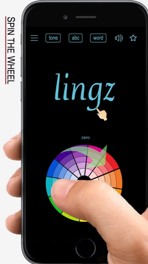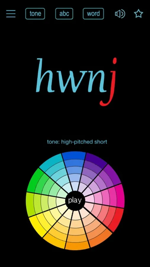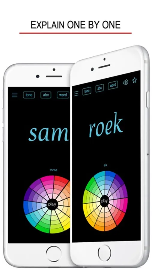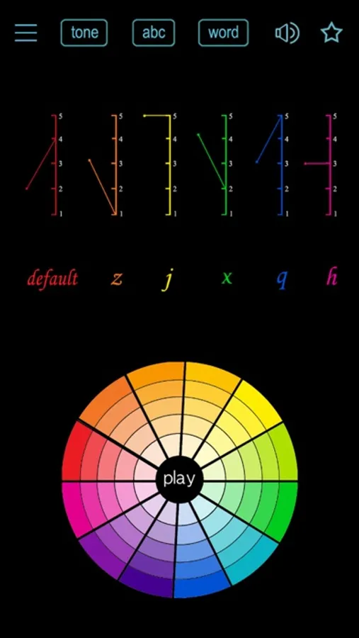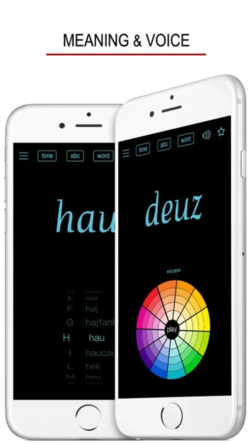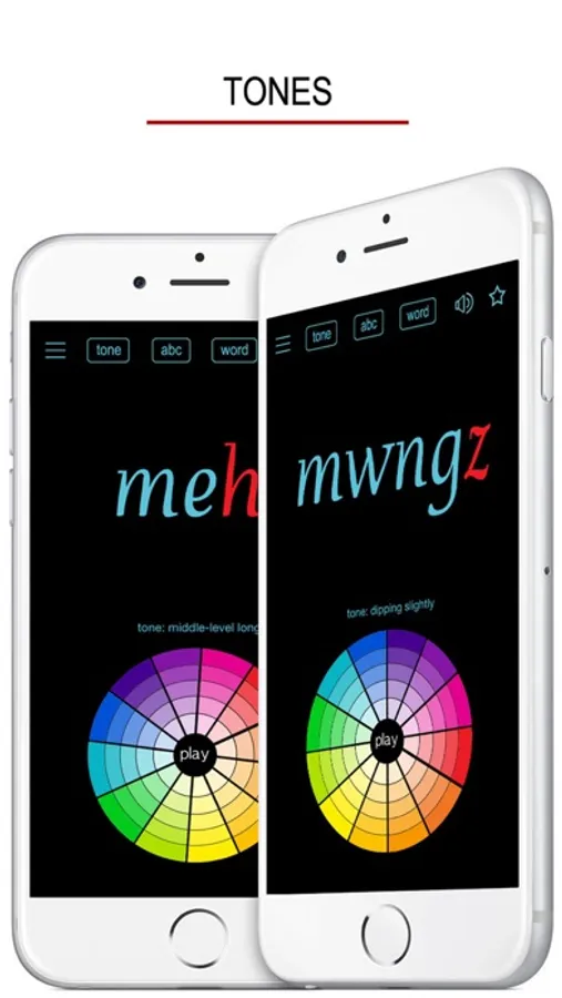 You can select the word in alphabetical order by clicking “word” in the menu bar. The "tone" button is for the six main tones of the Zhuang language.