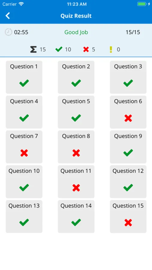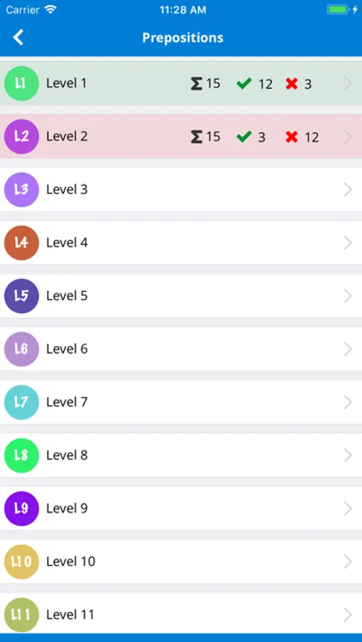 With the progress page provided in the app you can see your total score and result in each english test. There are three scales from bad to perfect which indicate your percentage. If your total score is colored green then you are ready for a new level.