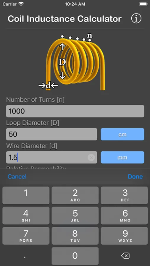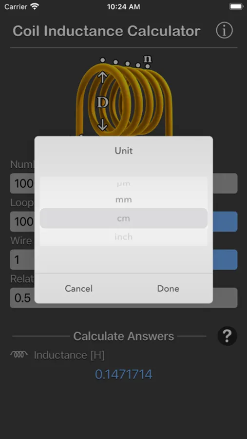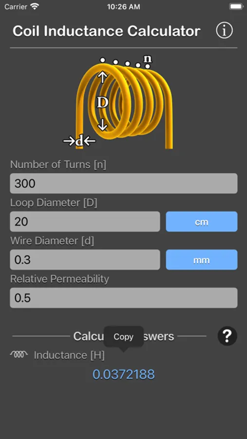 Coil Inductance Calculator calculate the inductance of a coil of wire by input the number of turns, loop diameter, wire diameter, and the permeability of the medium.