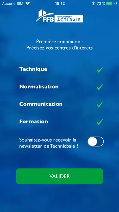Dès la première connexion, personnalisez votre application en choisissant vos centres d'intérêt. Vous aurez accès à tous les métiers représentés par le groupement ACTIBAIE mais ne recevrez de notifications que pour les sujets qui vous intéressent.