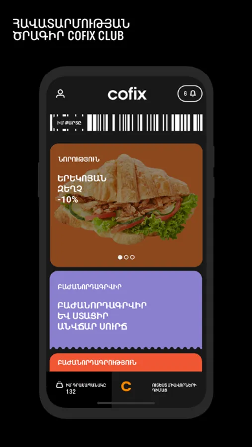 Check in every order (read the barcode at the cash register), get bonus cacheback and other privileges of the Cofix Club loyalty program.