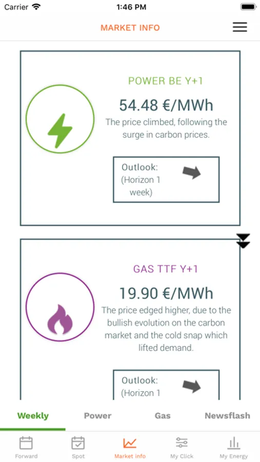 - Consult market forward prices and set alerts on thresholds when you would like to be informed by a push notification. This can be interesting to optimize the moment when you buy your energy