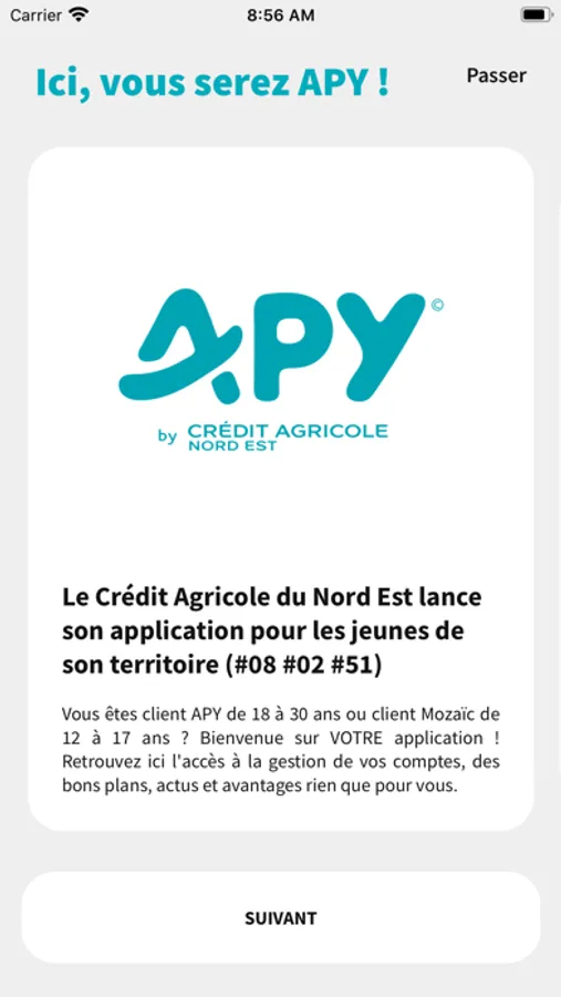 L’application APY est destinée aux clients âgés de 18 à 30 ans du Crédit Agricole du Nord Est. Et bonne nouvelle, les clients Mozaïc, âgés de 12 à 17 ans peuvent également y accéder et retrouver tous leurs avantages Mozaïc.