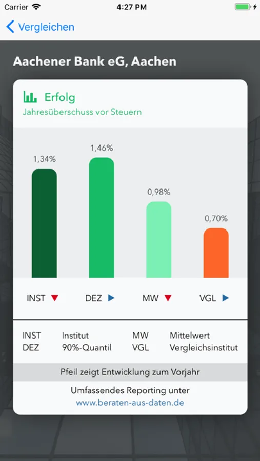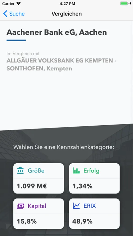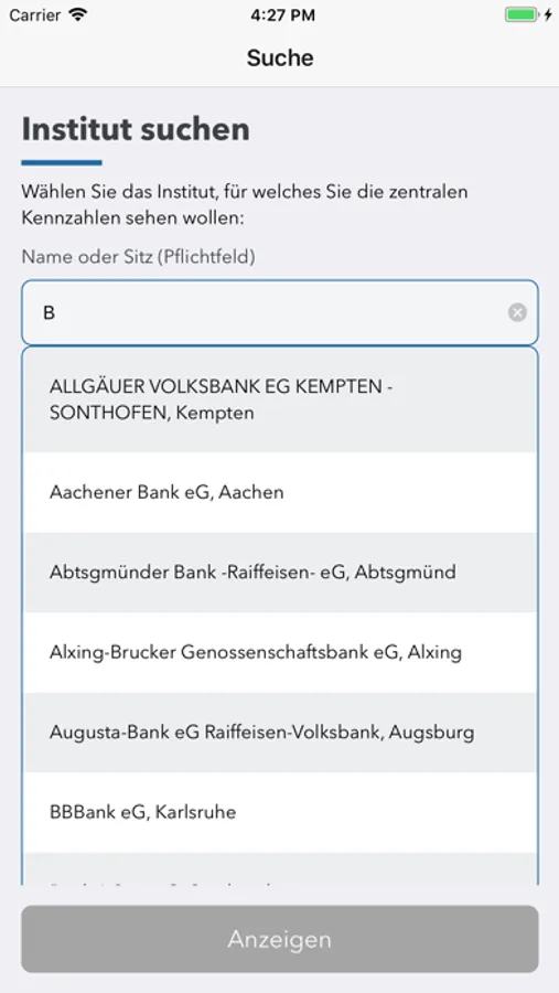 Die App ist kostenlos, die Bedienung einfach: Nach erfolgter Registrierung können in das obere Eingabefeld Institutsname oder alternativ Sitz der Bank (z.B. Stuttgart) eingegeben und bei mehreren Treffern aus der angezeigten Auswahlliste das gewünschte Haus ausgewählt werden. Optional kann zu Vergleichszwecken ein weiteres Institut in das untere Eingabefeld eingetragen werden.