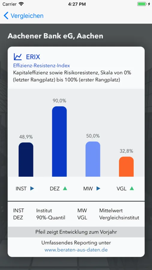 Mit der ERIX-App können zentrale betriebs- und risikowirtschaftliche Kennzahlen zu rd. 1.400 deutschen LSIs schnell abgerufen und untereinander verglichen werden. Angezeigt wird auch der Kennzahlentrend gegenüber dem Vorjahr.