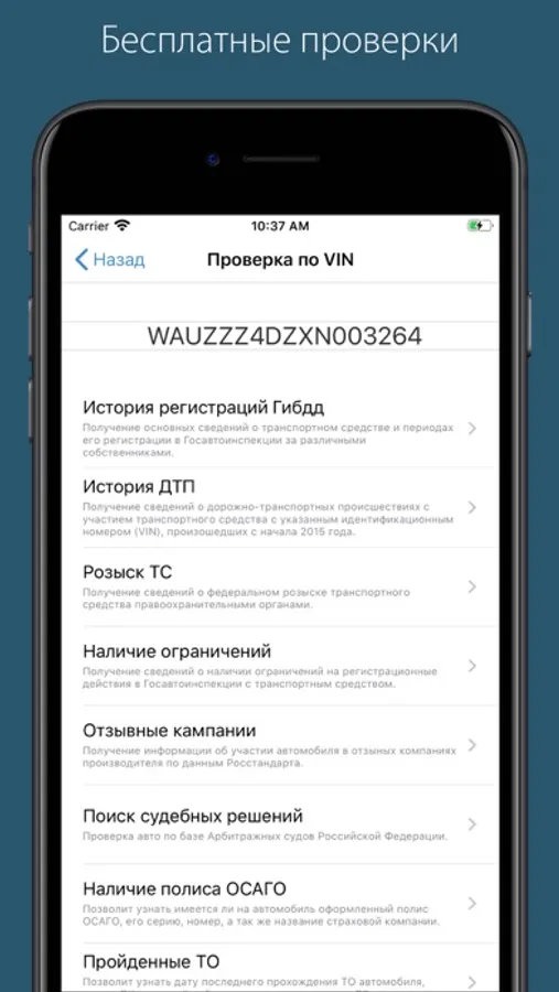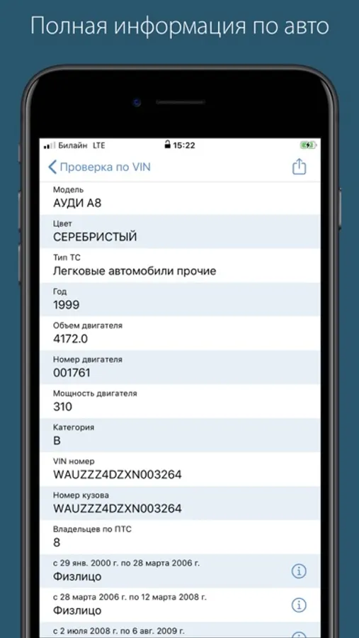 - Историю регистрации транспортного средства, участие в ДТП.