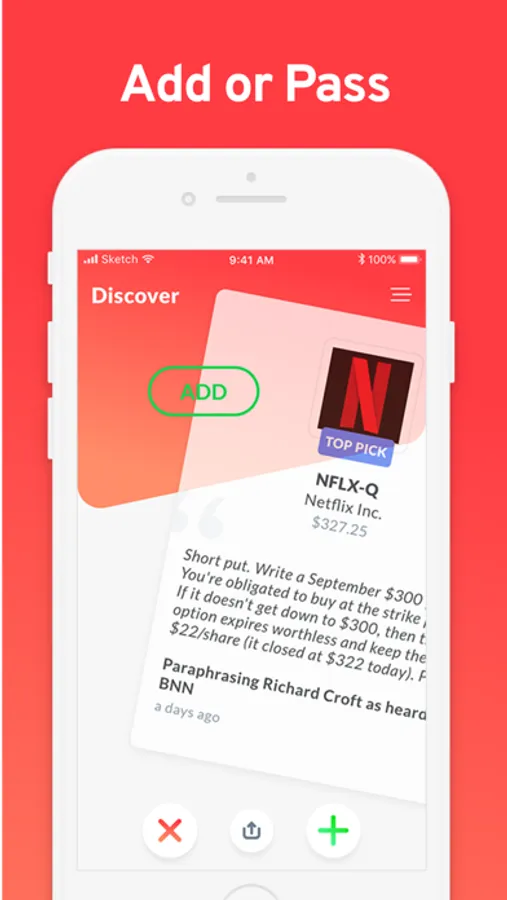 Focus on the top picks. Browse the top picks and swipe left to add to your watch list or right to pass to the next stock.
