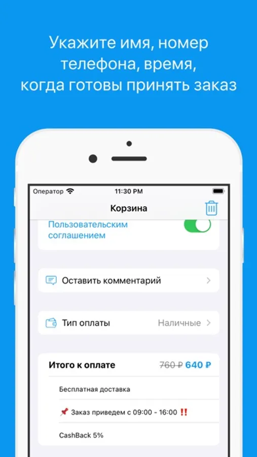 Укажите время, когда хотите прийти за своим заказом или выберите доставку с указанием времени и адреса доставки.
