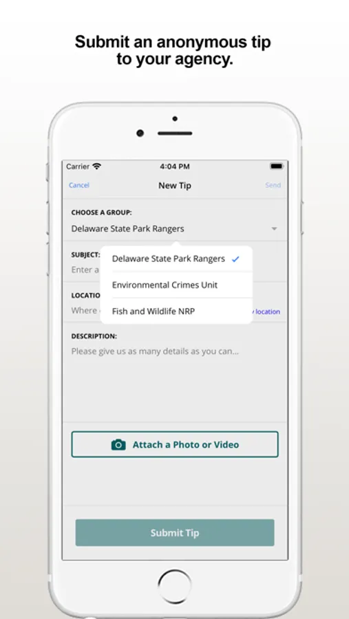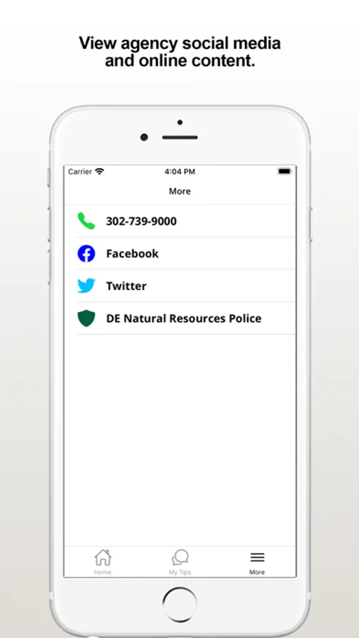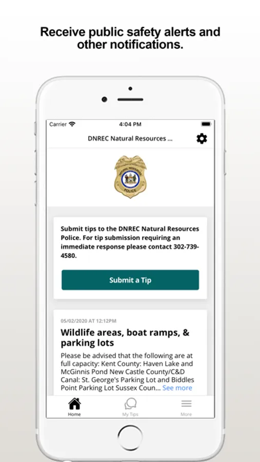 The DENRP Tip app provides citizens the ability to submit anonymous tips to the Deleware Fish & Wildlife Natural Resources Police, DE State Park Rangers, Environmental Crimes Unit and Fish and Wildlife Enforcement. The app also displays agency crime alerts, and other organization web and social media content.