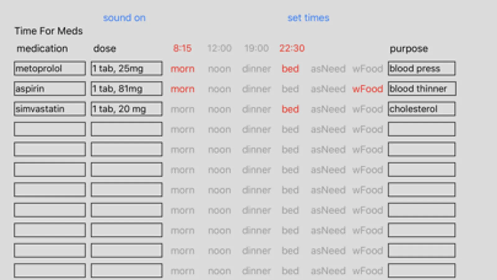 Activate the time to take that med by touching in one or more of the time columns on the same line.