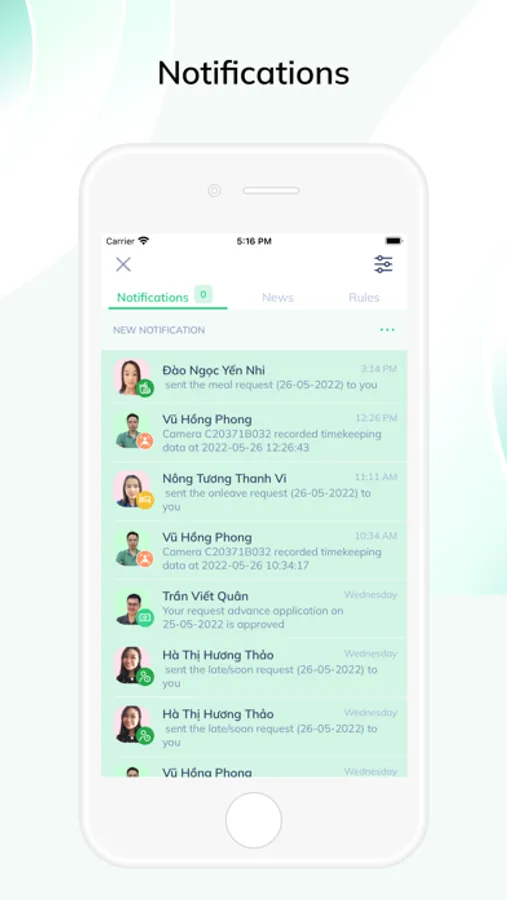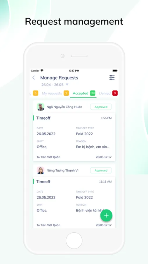 - Approve requests for leave, overtime, advance, additional work...
