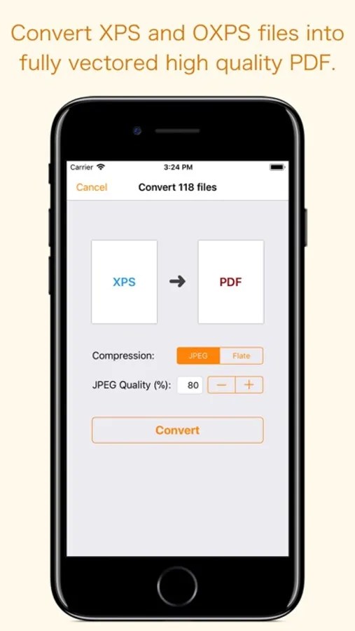 XPS-to-PDF is a simple, efficient and fast way to batch convert XML Paper Specification (.xps) and OpenXPS (.oxps) documents into fully vectored high quality PDF files on iPhone and iPad. XPS-to-PDF supports JPEG and Flate image compression types and JPEG quality settings for PDF conversion.