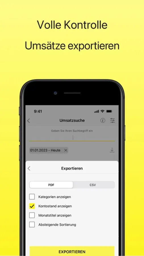 ◉ Behalten Sie den Überblick: Umsätze und Kontostand auf einem Blick, Zuordnung nach Umsatzkategorie, sowie Such-, Filter- und Exportmöglichkeit.