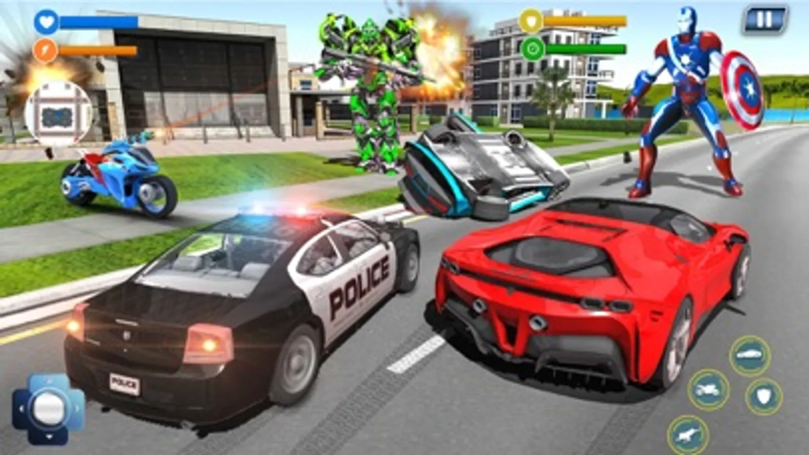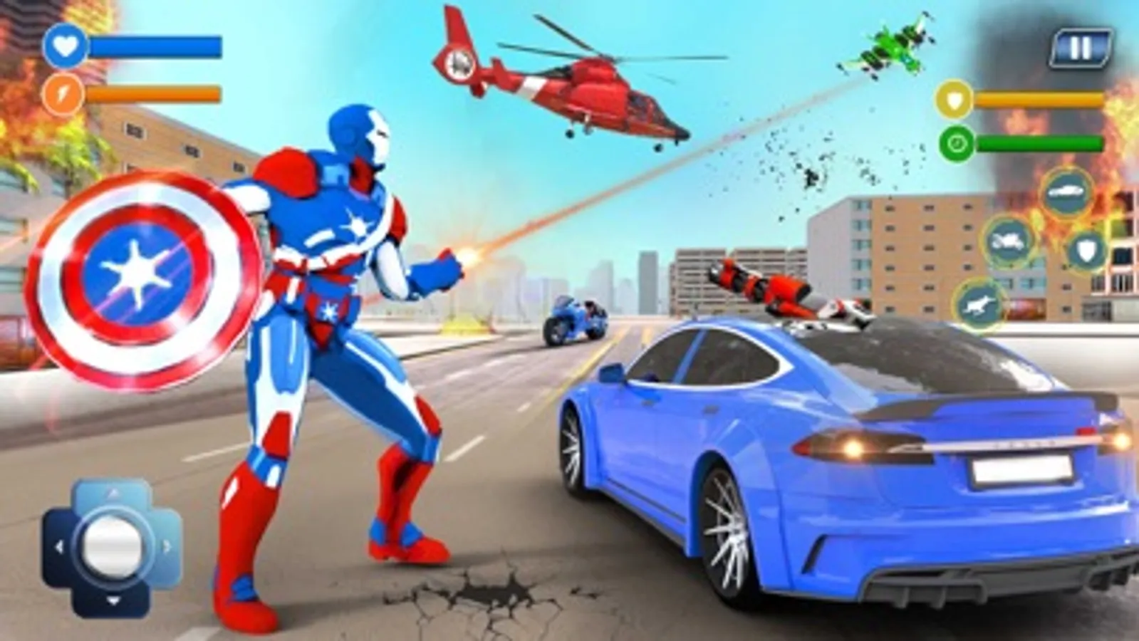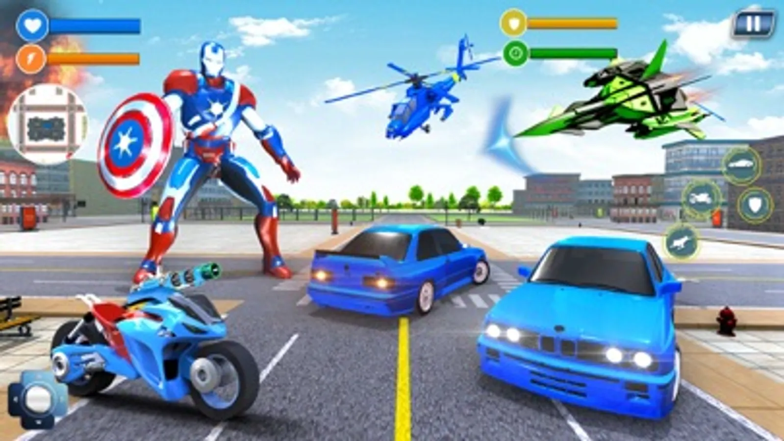 It’s time for ultimate survival in Captain Hero Bike Robot Rescue and rise to heights as flying robot Captain of America who transform into Robot Car and Robot Bike to rescue city in futuristic robot war. Help US Police win grand city battle for city rescue mission. Brand new bike robot transforming games brings Flying Captain USA hero of robot games who will exhibit super robot flying skills in amazing robot transformation games and flying rescue simulator. Gangster of crime city have created chaos and Miami police isn’t enough to fight them. For super city rescue mission flying robot super captain robot transformation into robot car and robot bike with futuristic robot battle will save super city and help US Police in city survival rescue games.